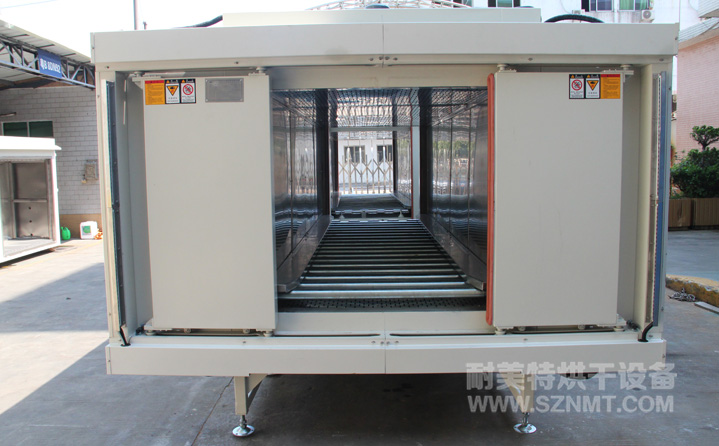 動(dòng)作流程:設(shè)備接收到需要工件進(jìn)箱信號(hào)→當(dāng)工件進(jìn)至烘箱前→觸發(fā)進(jìn)烘箱前行程開關(guān)→進(jìn)烘箱門自動(dòng)打開→工件進(jìn)到烘箱內(nèi)滾筒線尾端→感應(yīng)器接觸發(fā),阻檔器限位→關(guān)閉進(jìn)箱門→(預(yù)先設(shè)定烘烤溫度及烘烤時(shí)間)→烘烤時(shí)間到達(dá)后→設(shè)備接收到需工件出箱信號(hào)→開出箱門→工件自動(dòng)輸送出→工件輸送完成后觸發(fā)外部行程開關(guān)后→并閉出箱門